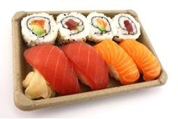 BeGreen Packaging biodegradable sushi trays are made from bulrush (also known as cattails), a rapidly growing common marshland plant, harvested from the wild. The plant???s rapid growth and annual renewability make it an ideal sustainable raw material, as it regenerates easily and abundantly. Harvested by hand in southeastern China, the plant fibers are made into rolls of paper, which are then pulped. The pulp is then molded into sushi trays at carefully-monitored factories, and packaged ready for use. After customers have used the trays, they can place them into a recyle bin or a home or commercial compost system, and they will compost within approximately 90 days.